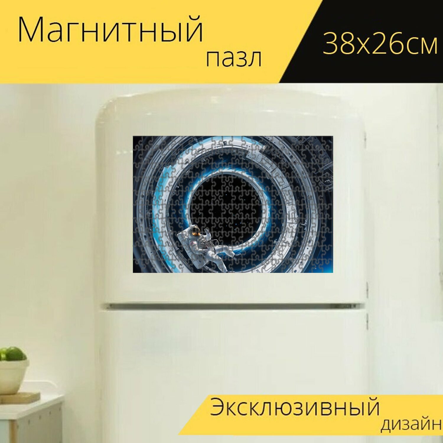 Магнитный пазл "Путешествие космонавтов через червоточину" для интерьера, 38х26 см. интересное: