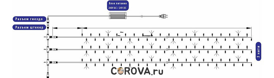 Гирлянда "LED ClipLight" 24V, 3 нити по 10 метров, цвет диодов Синий 323-313