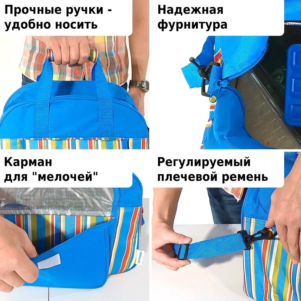 | Плюсы: | Аккуратные строчки, большая вместимость сумки. Если добавить охлаждающие элементы продукты остаются холодными более 5-ти часов. |