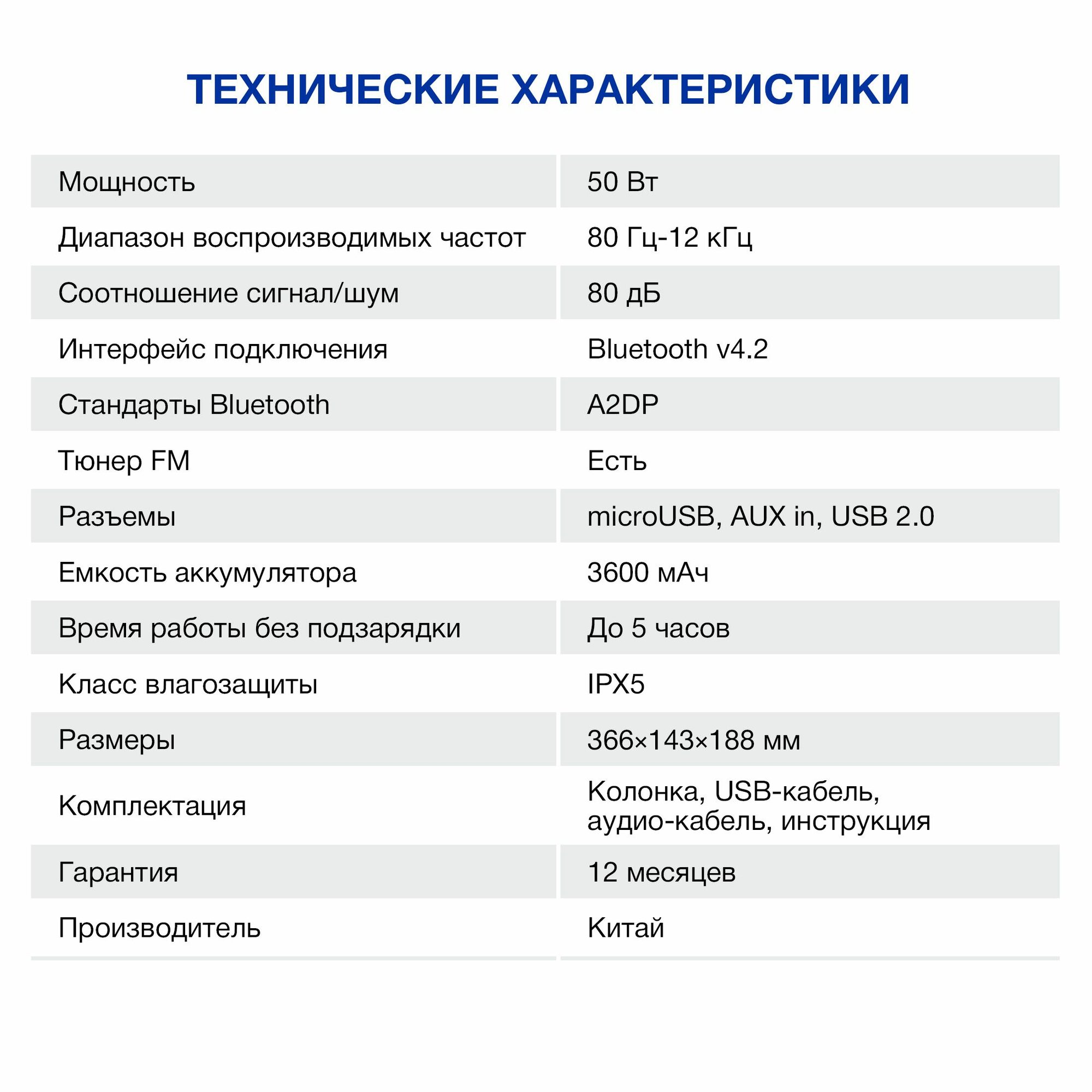 | Плюсы: | Длительность работы от одной зарядки. Громкость. Хороший бас. Крепкий корпус. Есть защита от воды. |