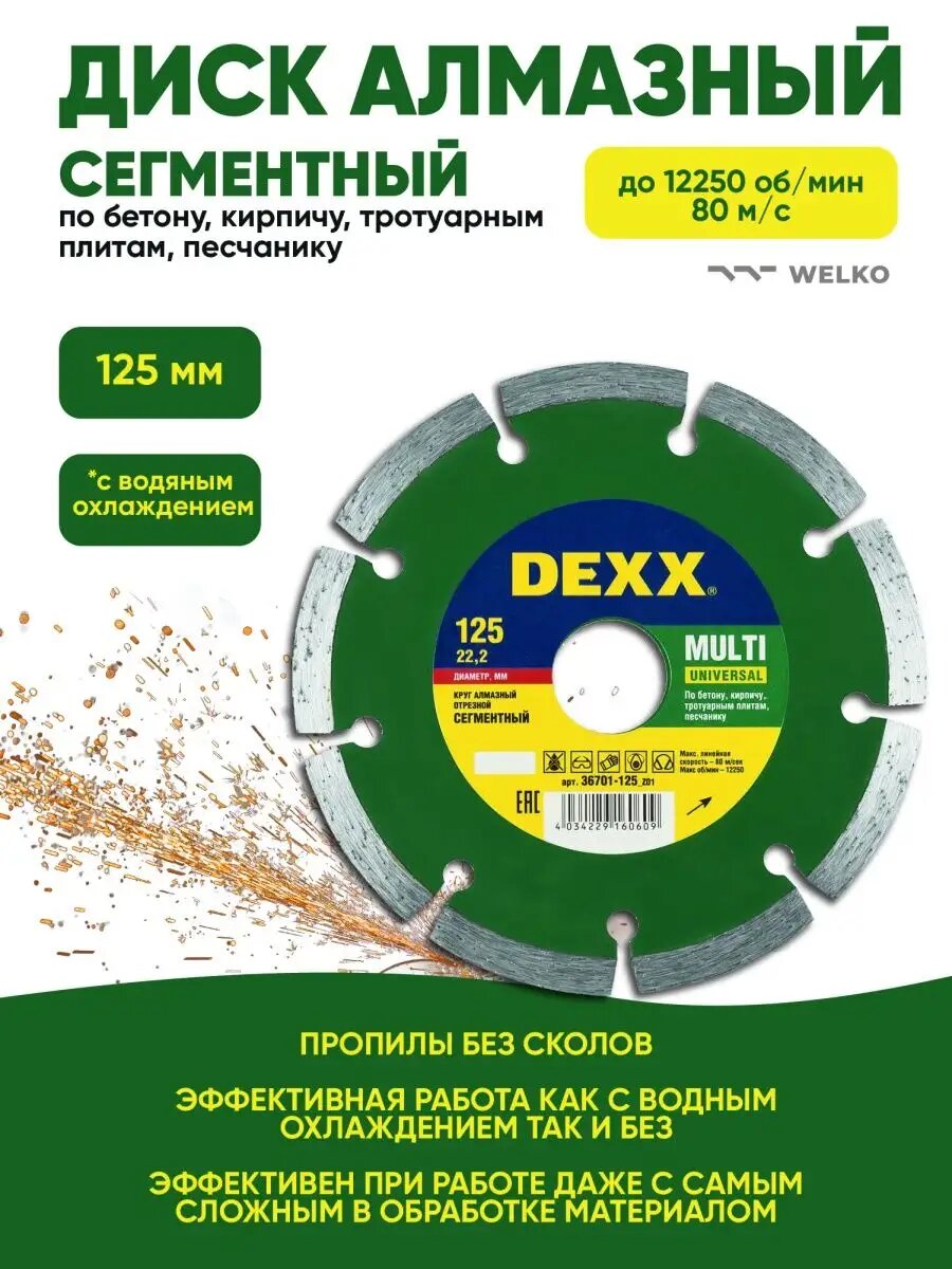 DEXX MULTI UNIVERSAL 125 мм, диск алмазный отрезной сегментный по бетону, кирпичу, тротуарным плитам, песчанику (125х22.2 мм, 7х1.9 мм), 36691-125 (36701-125_z01)