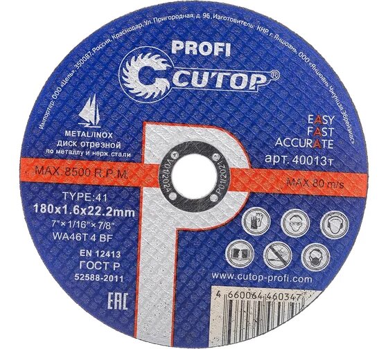 Профессиональный диск отрезной по металлу и нержавеющей стали Profi Т41-115 х 1,6 х 22,2 мм, CUTOP 50-558 (1 шт.)