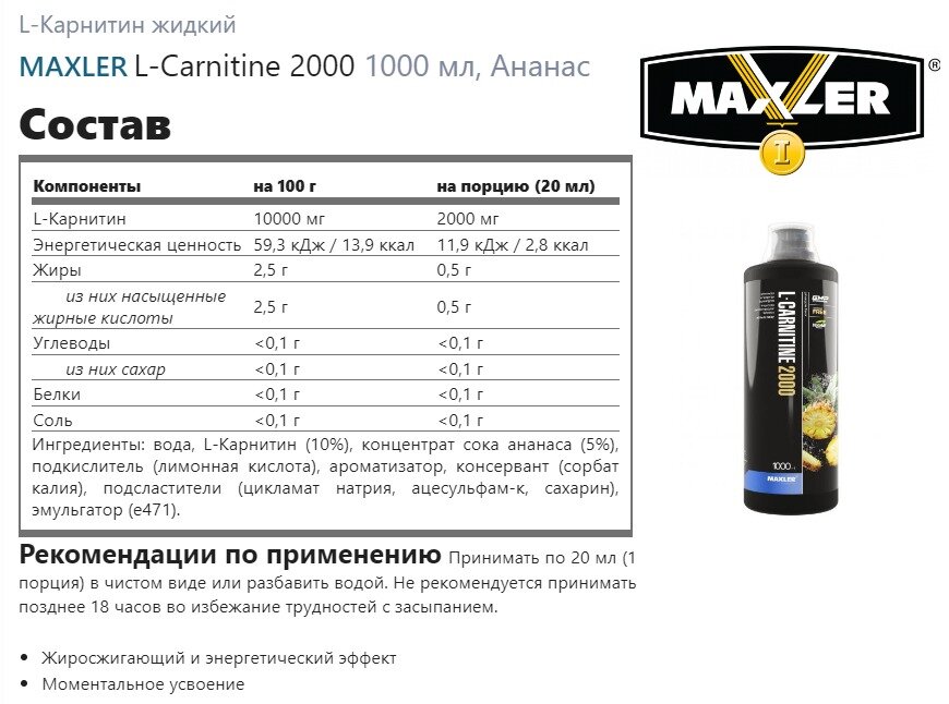 Ниже Вы можете прочитать отзывы на L-Carnitine 2000 1000 мл. в жидкой форме (Maxler) Ананас, ознакомится с подробными характеристиками, посмотреть интересные обзоры и фотографии на L-Carnitine 2000 1000 мл. в жидкой форме (Maxler) Ананас.