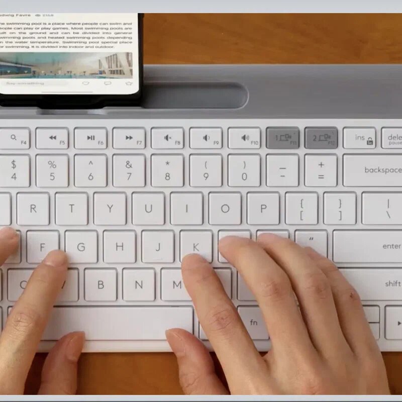 Короткий четкий ход клавиш, возможность очень быстрой печати. В этом похожа на ноутбучные клавиатуры, но клавиши даже тише и четче большинства из них. Включая пробел, который на других "бесшумных" клавиатурах бывает довольно громким. Возможность вернуть классическое поведение клавиш F1 - F12 через Fn-lock , который активируется через Fn+Esc. Размер и форма. Это действительно slim-клавиатура, тонкая, в то же время очень устойчивая на столе. Компактный размер без ущерба для расположения основных клавиш, что означает лучшую доступность лежащей рядом мыши и большую свободу движения для нее. Место под телефон. Хотя в моем случае это место пригодится скорее для хранения шариковой ручки или бумаг, с которых можно перепечатать текст в компьютер. Возможность набора текста на телефоне. Есть отзывы, которые говорят о невозможности переключать язык ввода. На самом деле в Android нужно зайти в настройки внешней клавиатуры и установить там флажки "Русский" и "Английский" (или другие языки). Тогда переключение будет доступно через Ctrl + Space (не через Fn+Space, на который реагирует встроенная клавиатура Android сразу после подключения, но не меняя при этом язык ввода) |