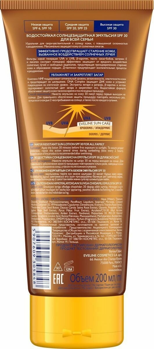 Эмульсия солнцезащитная Eveline Sun Care SPF30, водостойкая, 200 мл