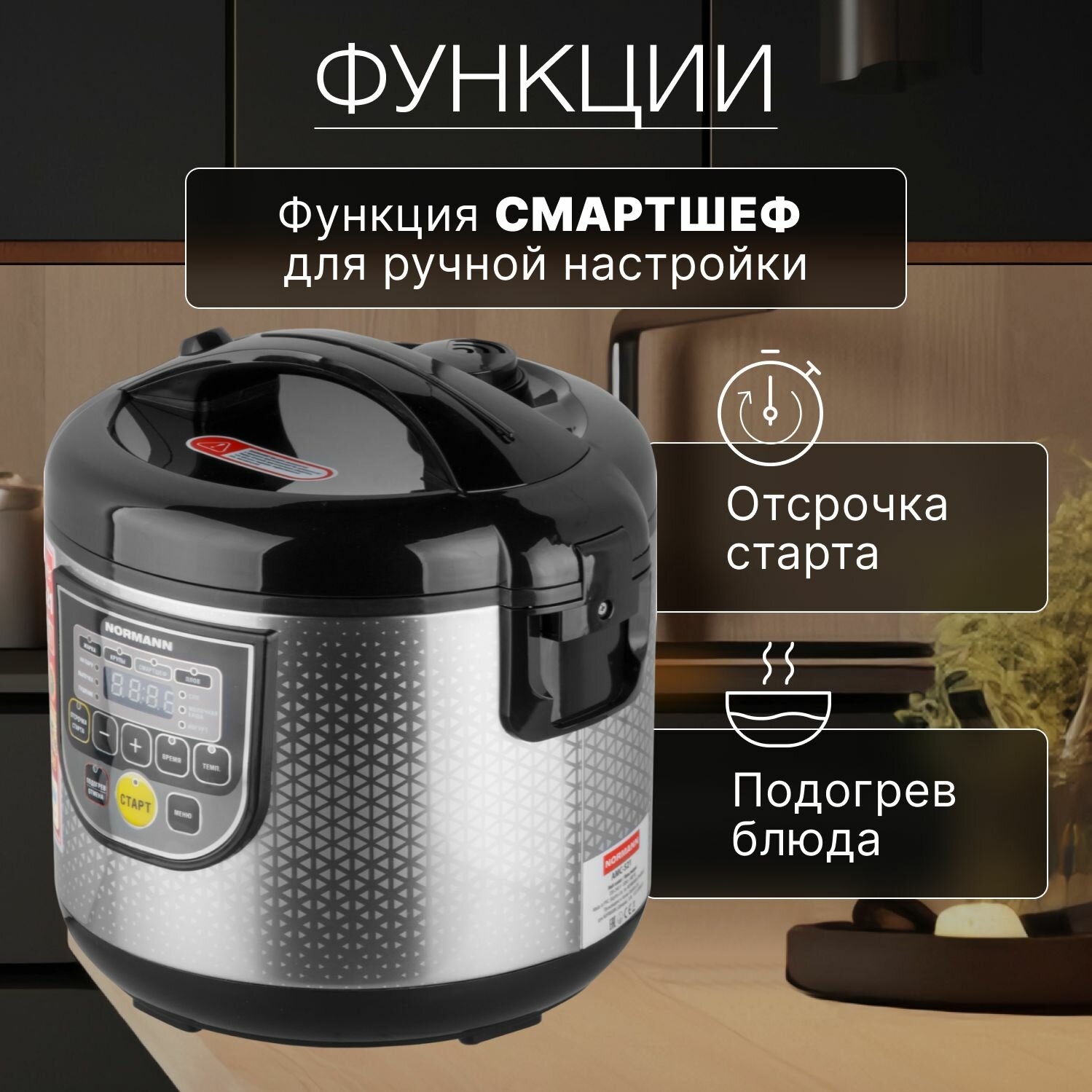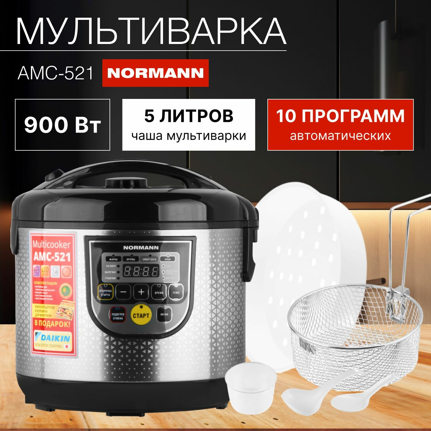 Мультиварка NORMANN AMC-521 (900 Вт; 5л; 10 программ; смартшеф; паровая корзина; фритюр; покрытие Daikin)