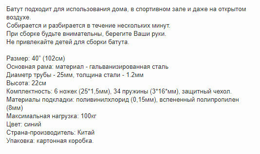 | Минусы: | Габаритная, тонкая, коробка (метр на метр), что нужно учитывать при ручной транспортировке или с помощью легкового автомобиля. Но это, скорее особенность, а не недостаток, ведь батут не складной. При регулярном использовании батута, примерно раз в несколько дней, нужно подкручивать ножки. |