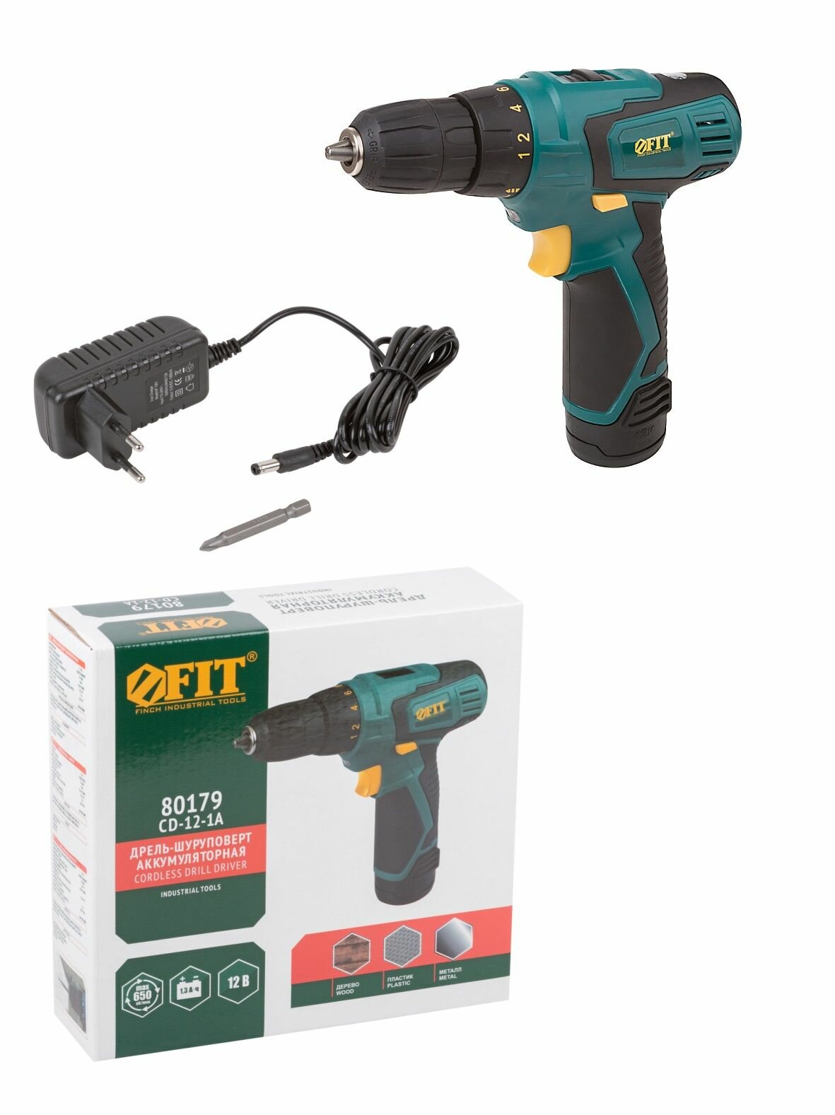Дрель-шуруповерт аккумуляторная 12,0 В, 0-650 об/мин, 15,0 Нм, 1 (Li-Ion) 1,3 Ач, 1 ч. FIT 80179