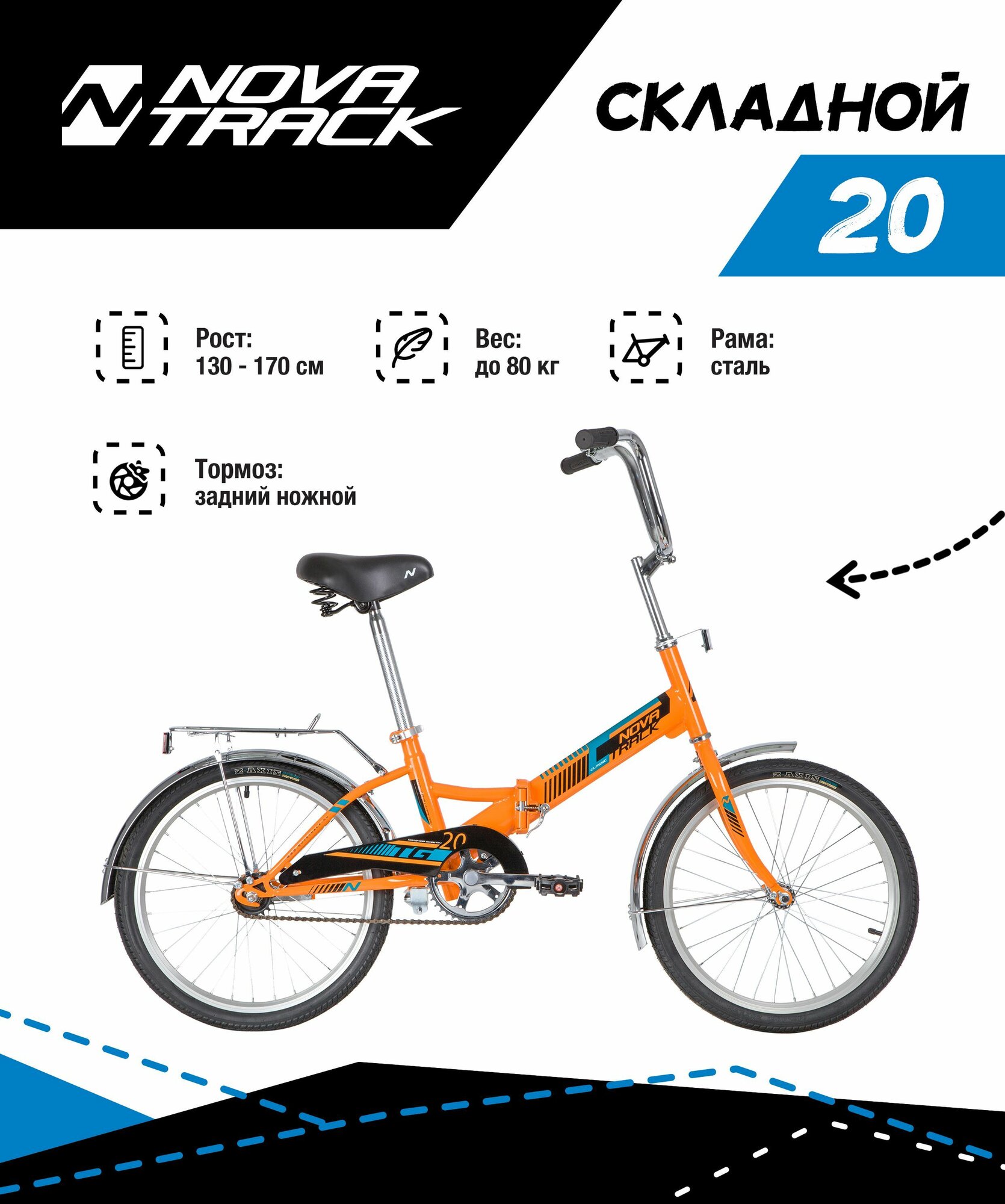 Велосипед NOVATRACK 20" складной 2020 , TG20, оранжевый, тормоз нож, двойной обод, багажник