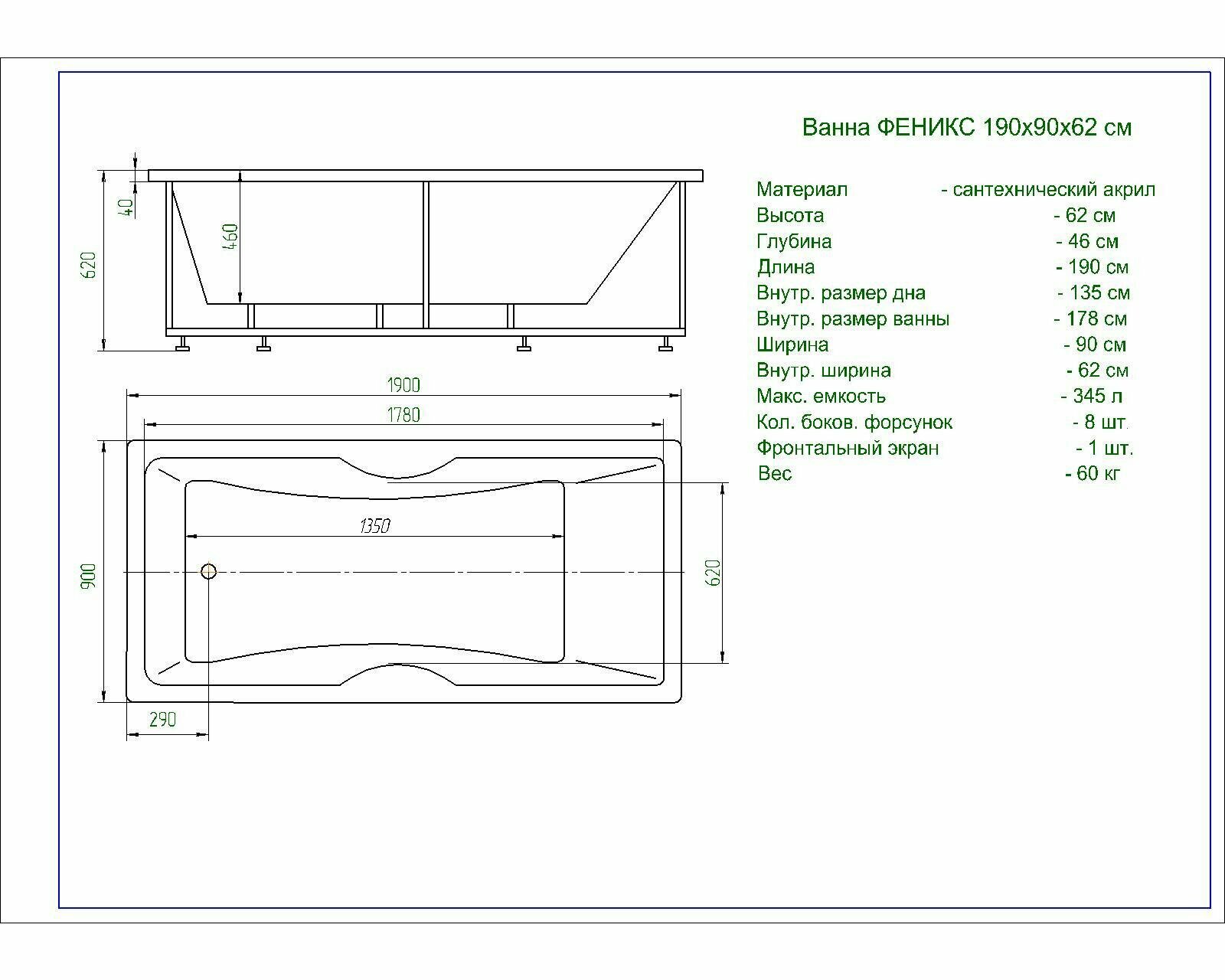 Акриловая ванна Феникс 190x90 FEN190-0000078 с фронтальным экраном (слив слева)