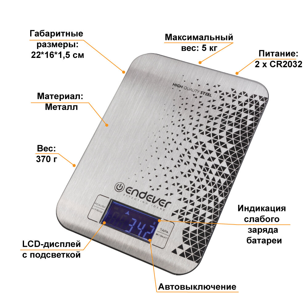 Весы кухонные электронные Endever Chief-536, до 5кг, LCD-дисплей с подсветкой и индикацией заряда батареи, батарейки в комплекте интересное: