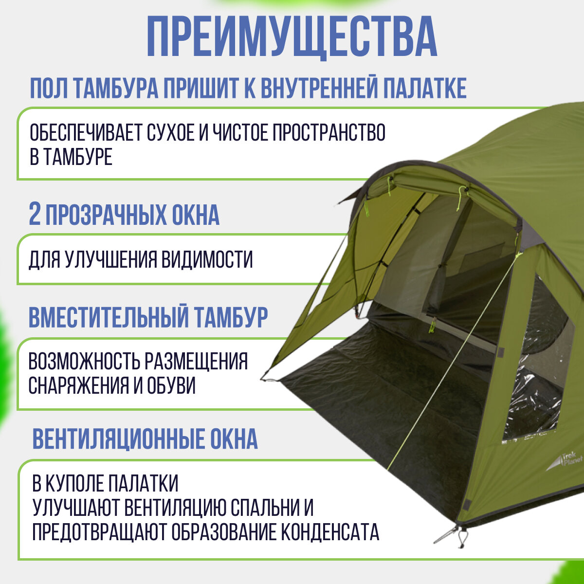 2. Достаточно свободного места внутри. 3. Большой тамбур, пол тамбура пришит к внутренней палатке. |