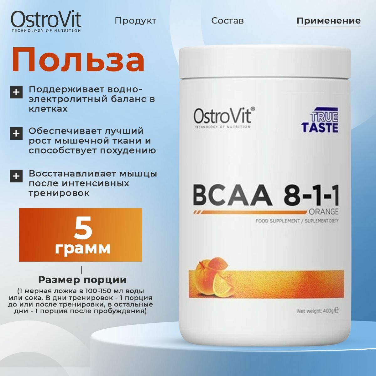Купить Ostrovit, BCAA 8:1:1, Спортивное питание, Аминокислоты для набора мышечной массы и похудения, порошок 400г со вкусом апельсина