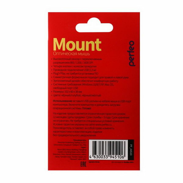 Мышь PERFEO PF-A4511 MOUNT проводная, оптическая, черный/желтый