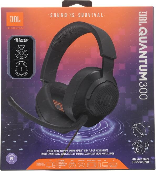 Наушники игровые JBL QUANTUM 300 [закрытые, 20–20000 Гц, микр., 3.5мм+USB, 7.1, черные]