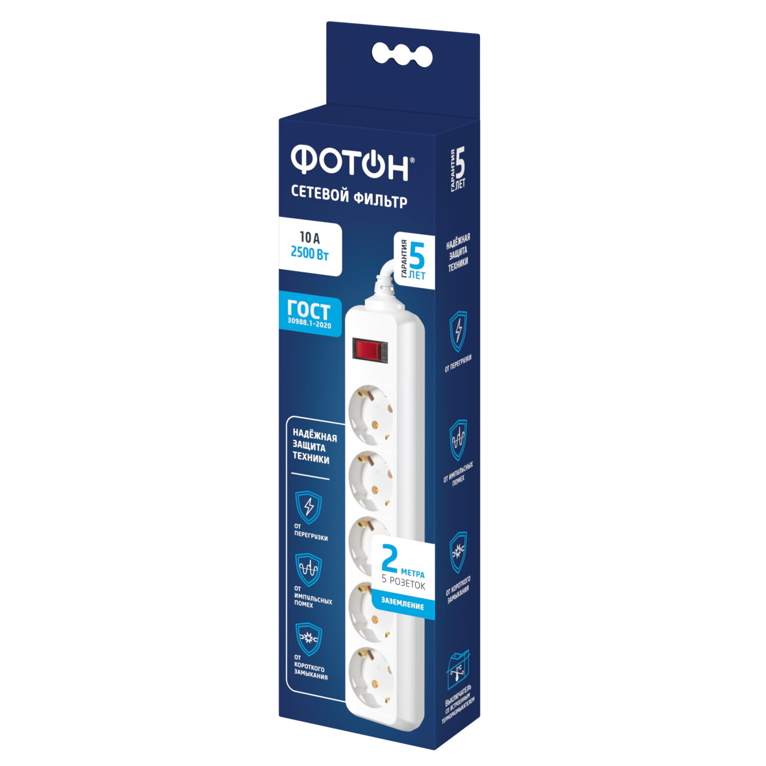 Сетевой фильтр удлинитель фотон 10А 2 метра 5 розеток с выключателем с заземлением белый, ГОСТ