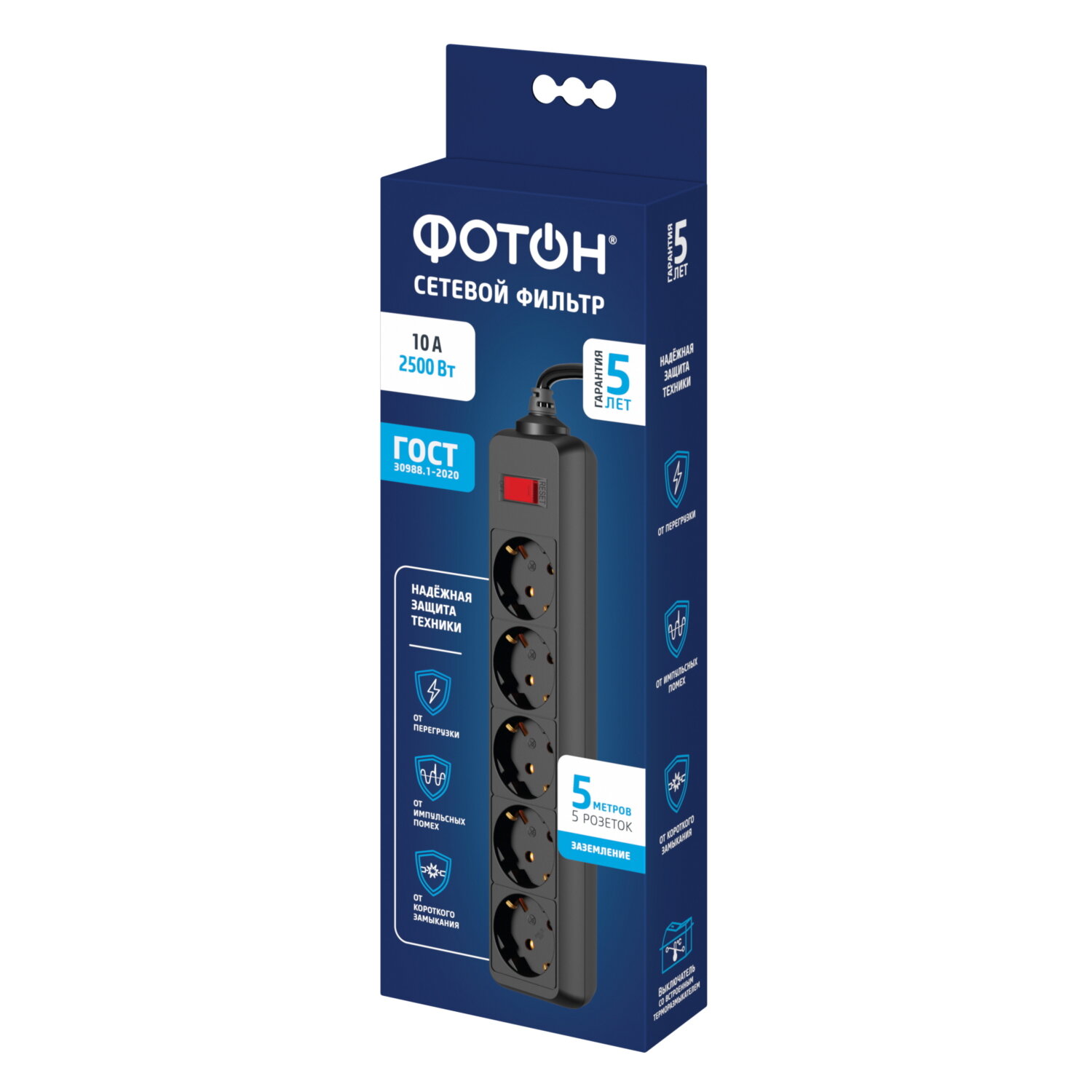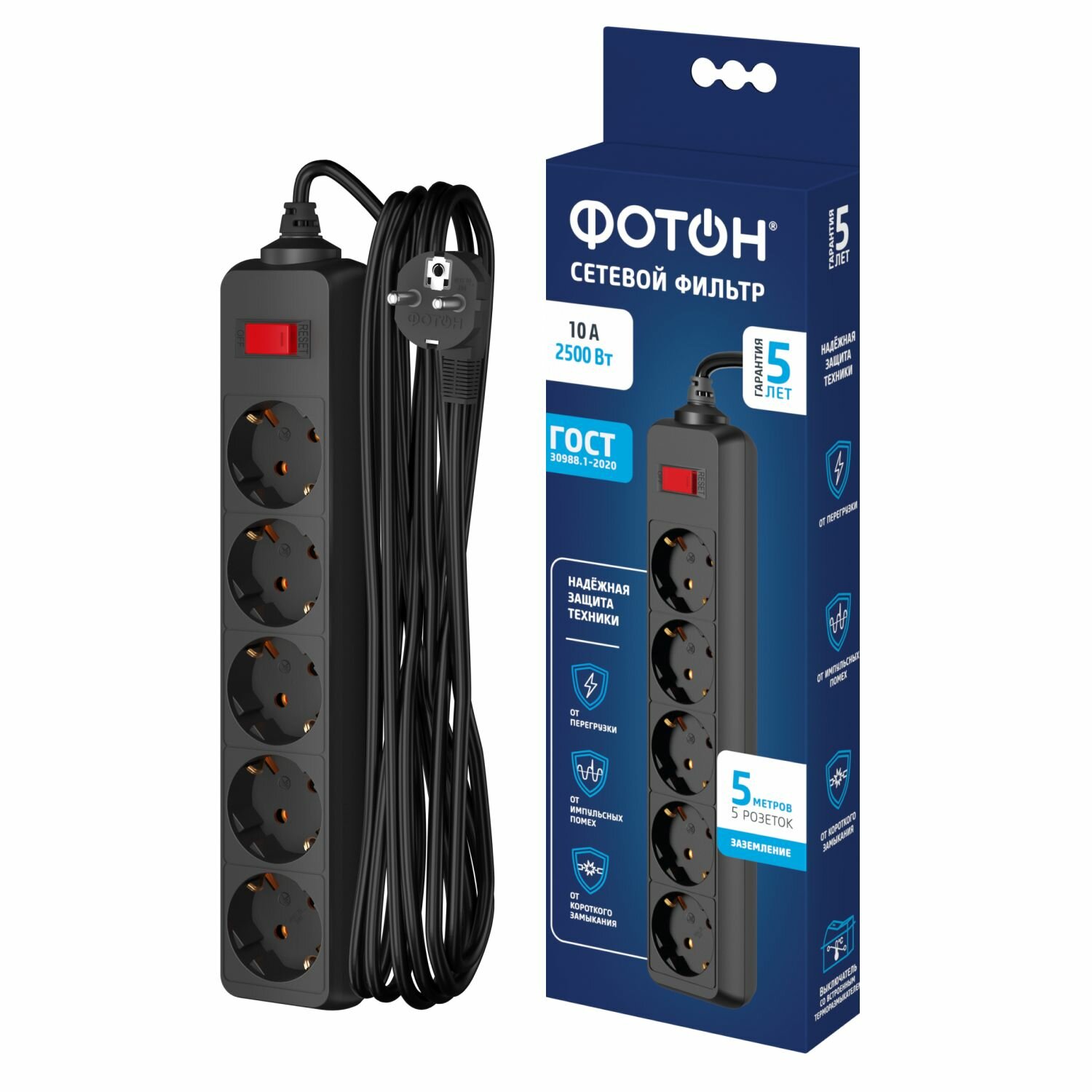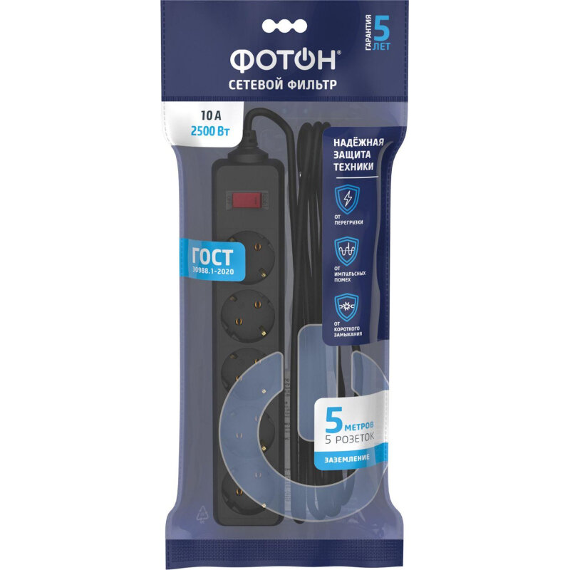 Сетевой фильтр удлинитель фотон 10А 5 метров 5 розеток с выключателем с заземлением черный, ГОСТ