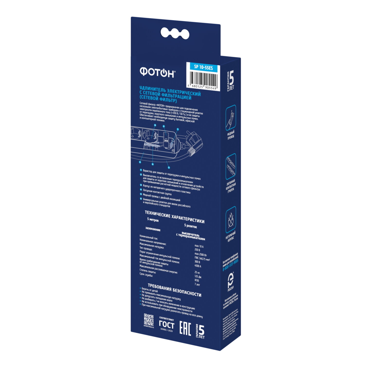 Сетевой фильтр удлинитель фотон 10А 5 метров 5 розеток с выключателем с заземлением белый, ГОСТ