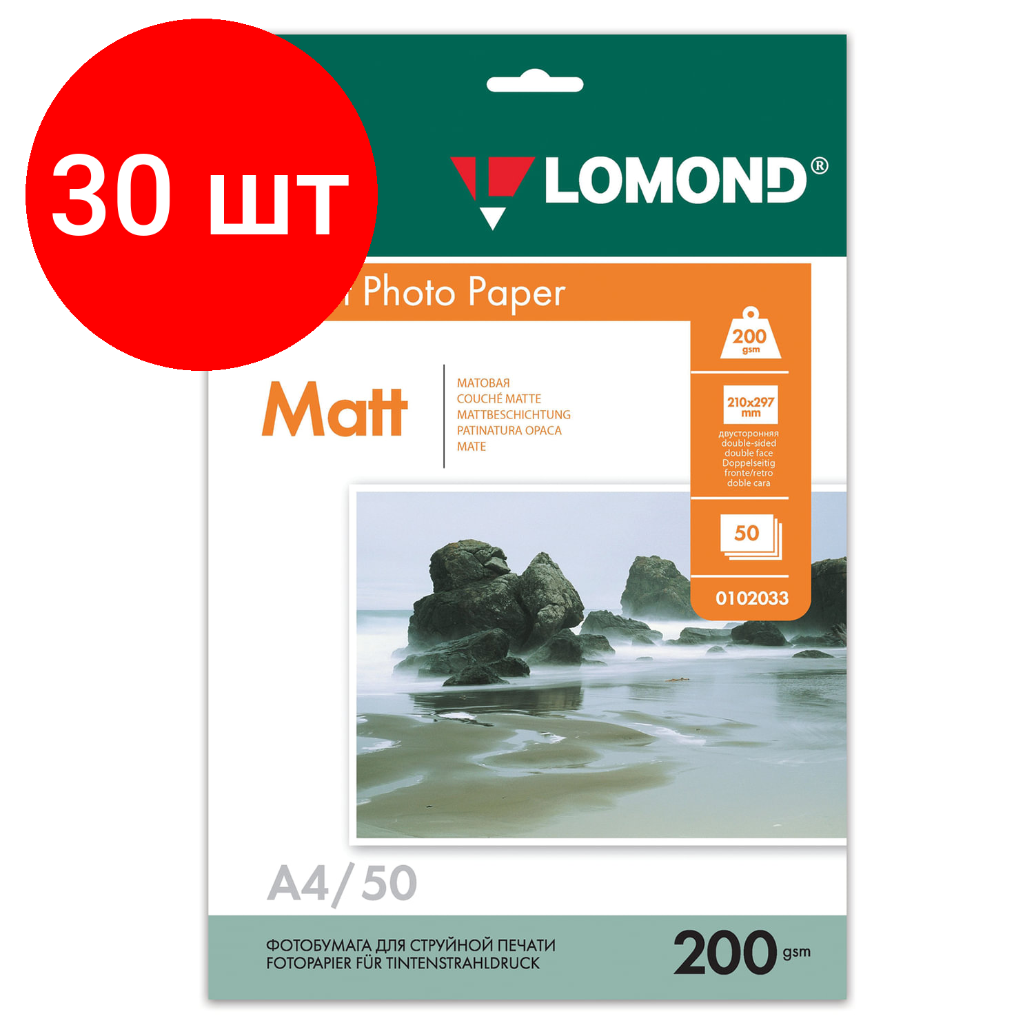 Купить Комплект 30 штук, Фотобумага LOMOND двусторонняя матовая 200г A4 50л 0102033