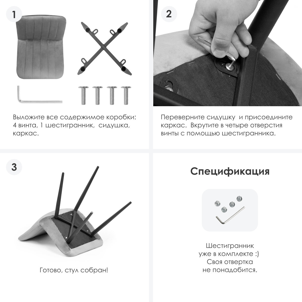 Был в разобранном виде Инструкции по сборке не было - в комплекте ножки(соединённые подвое), сидушка, спинка, соединительная планка. А ещё 4 самореза и несколько болтов. Пришлось посмотреть на фотки стула на маркете со всех ракурсов, чтобы понять что где подсоединять. Собирается за 5 минут(если есть шуруповерт) |
