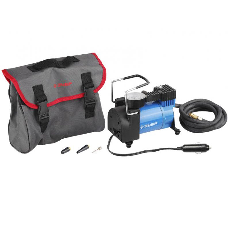 Компрессор ЗУБР "эксперт" автомобильный давление 10 атм, длина провода 3 м, длина шланга 2 м, 3 насадки