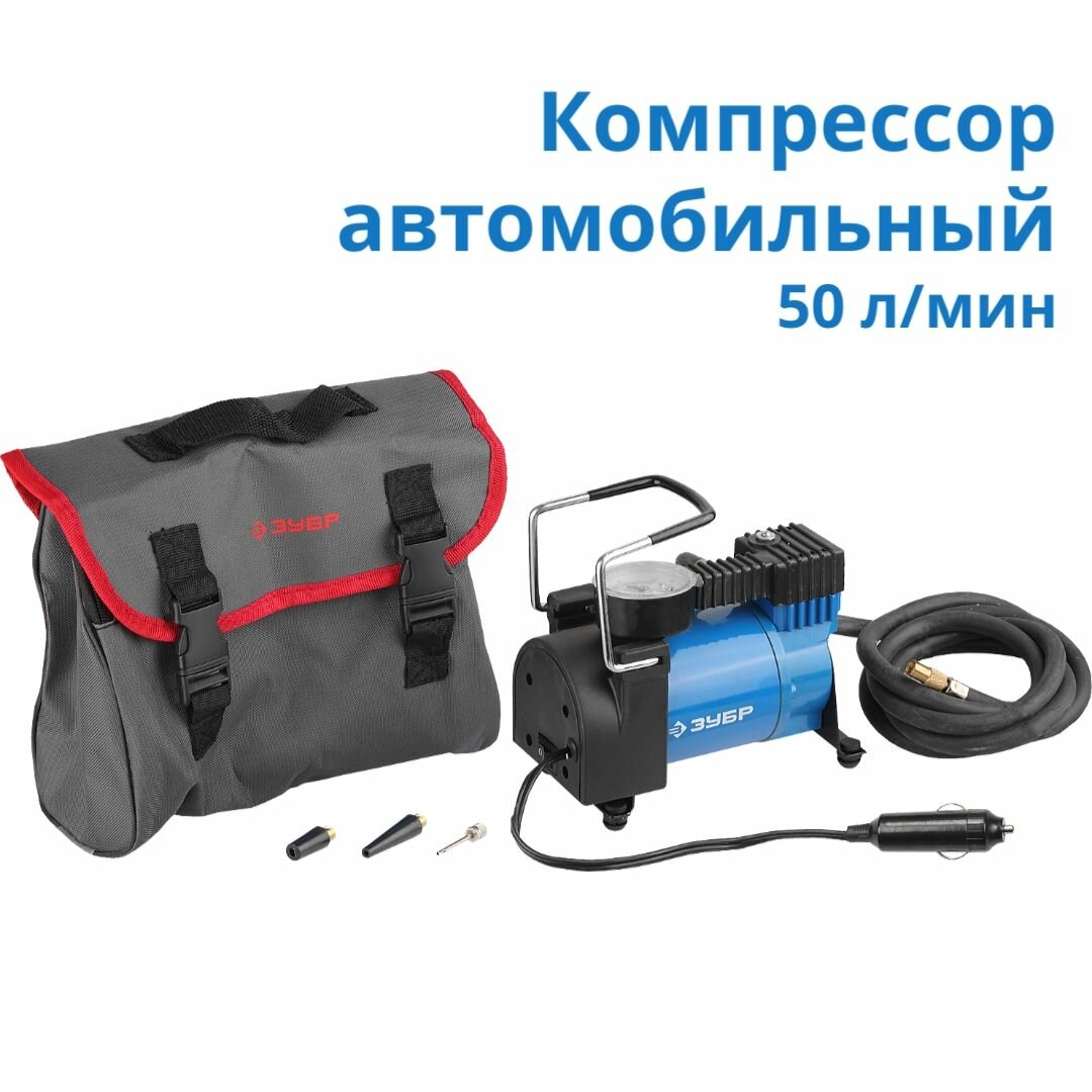 Компрессор ЗУБР "эксперт" автомобильный давление 10 атм, длина провода 3 м, длина шланга 2 м, 3 насадки