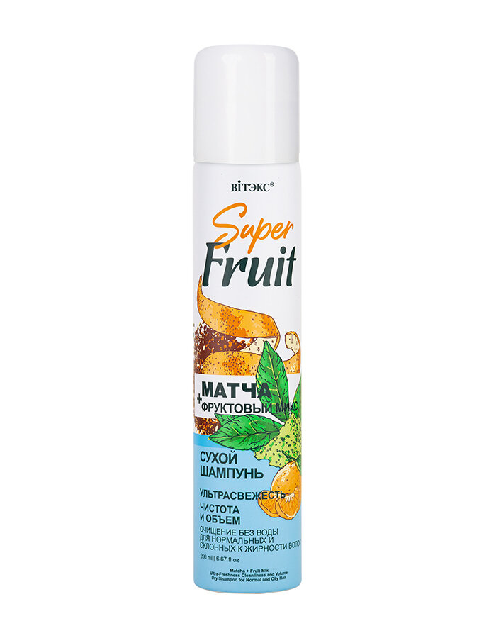 Купить Вiтэкс Super Fruit - Матча + Фруктовый Микс Сухой шампунь "ультрасвежесть. Чистота и объем" для нормальных и сколонных к жирности волос 200 мл.