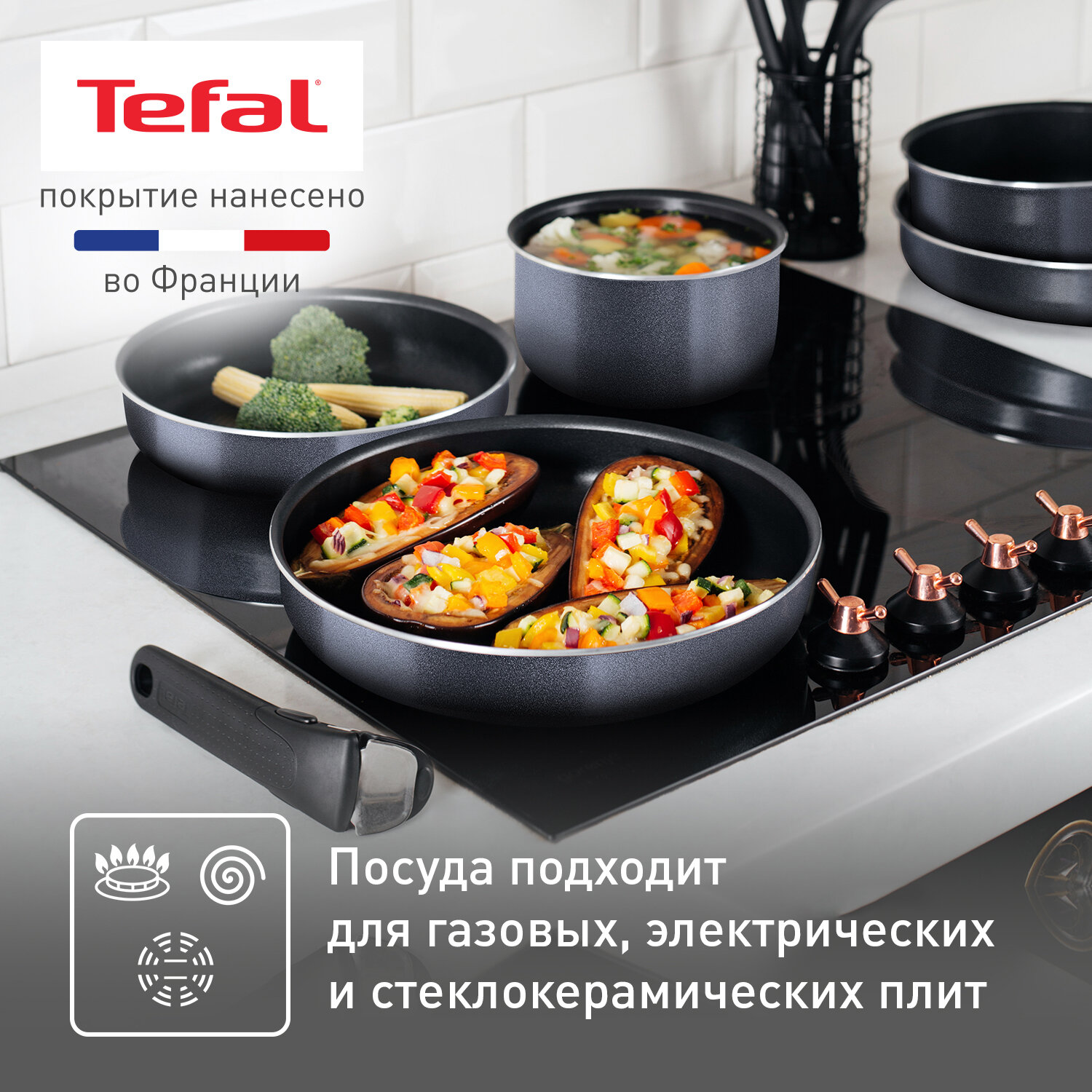 | Отзыв: | Данный набор привлёк внимание не только своей комплектацией, но и тем, что есть сменная ручка. У нас очень маленькая кухня и мест для хранения не хватает. А такой набор компактно помещается в шкаф. Качество посуды фирмы Tefal отличное. |