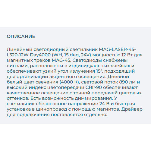 СохранитьСветильник MAG-LASER-45-L320-12W Day4000 (WH, 15 deg, 24V) (Arlight, IP20 Металл, 3 года) интересное: