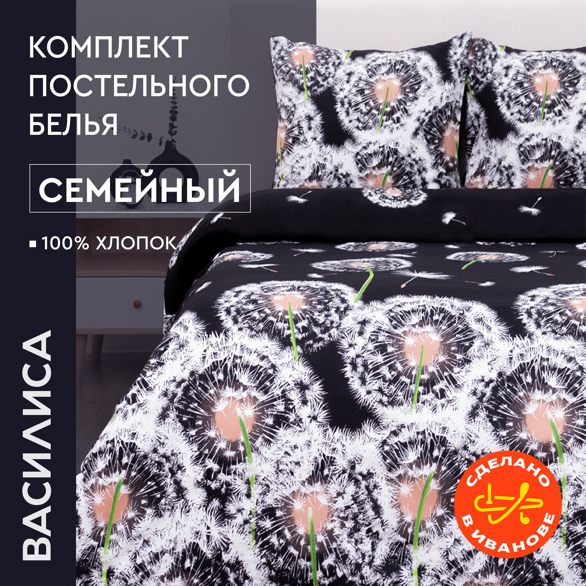 Комплект постельного белья Василиса Белые одуванчики, семейное, хлопок, черный/белый