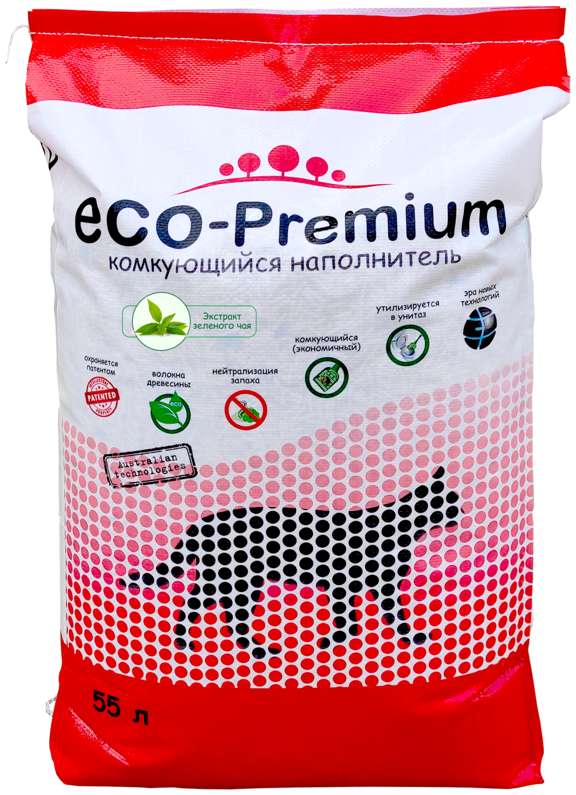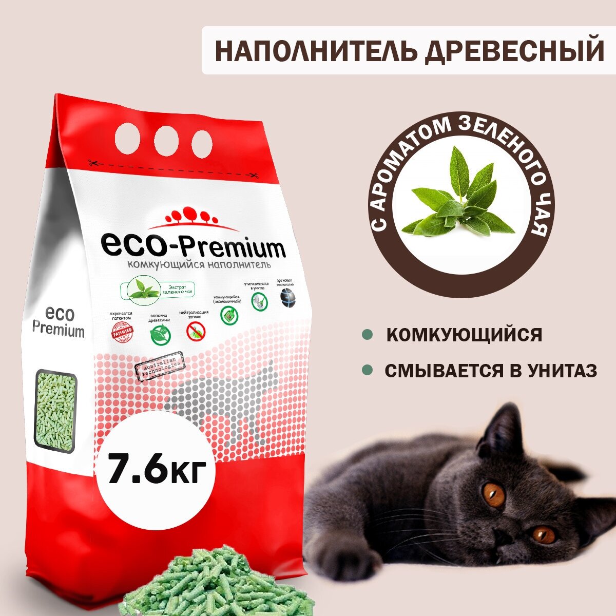 Наполнитель для кошачьего туалета комкующийся древесный с запахом зеленого чая ECO-Premium, упаковка 6 шт х 1,9 кг