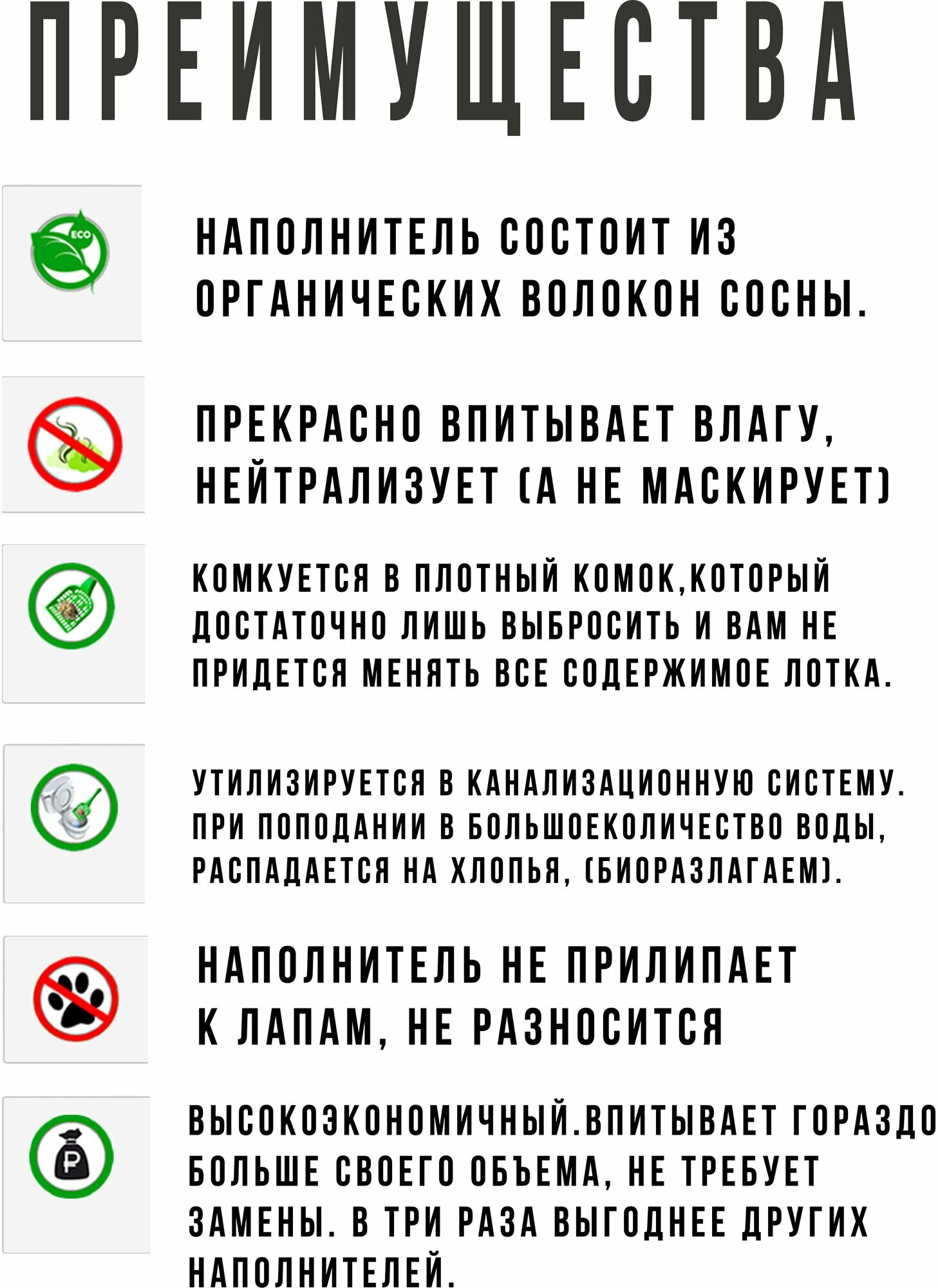 | Минусы: | Не впитывает жидкость, не держит запах, крошится в труху. |