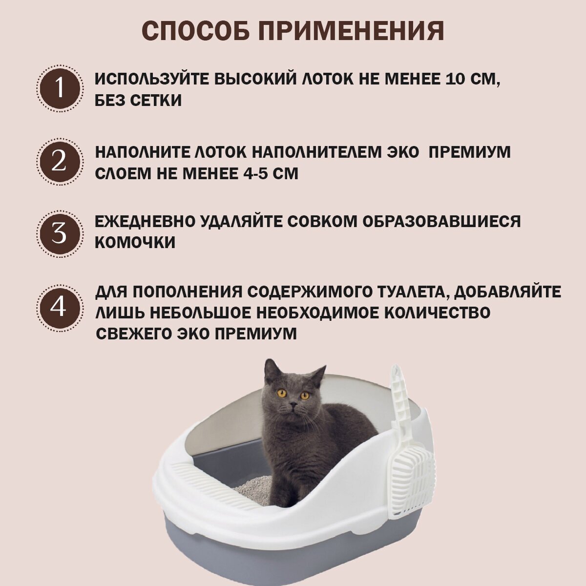 | Плюсы: | Не пылит, смывается в канализацию без последствий, не воняет |