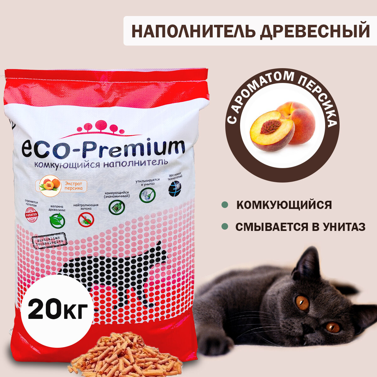 Наполнитель Эко Премиум для кошачьего туалета Древесный Комкующийся с ароматом Персика 20 л (7,6 кг)