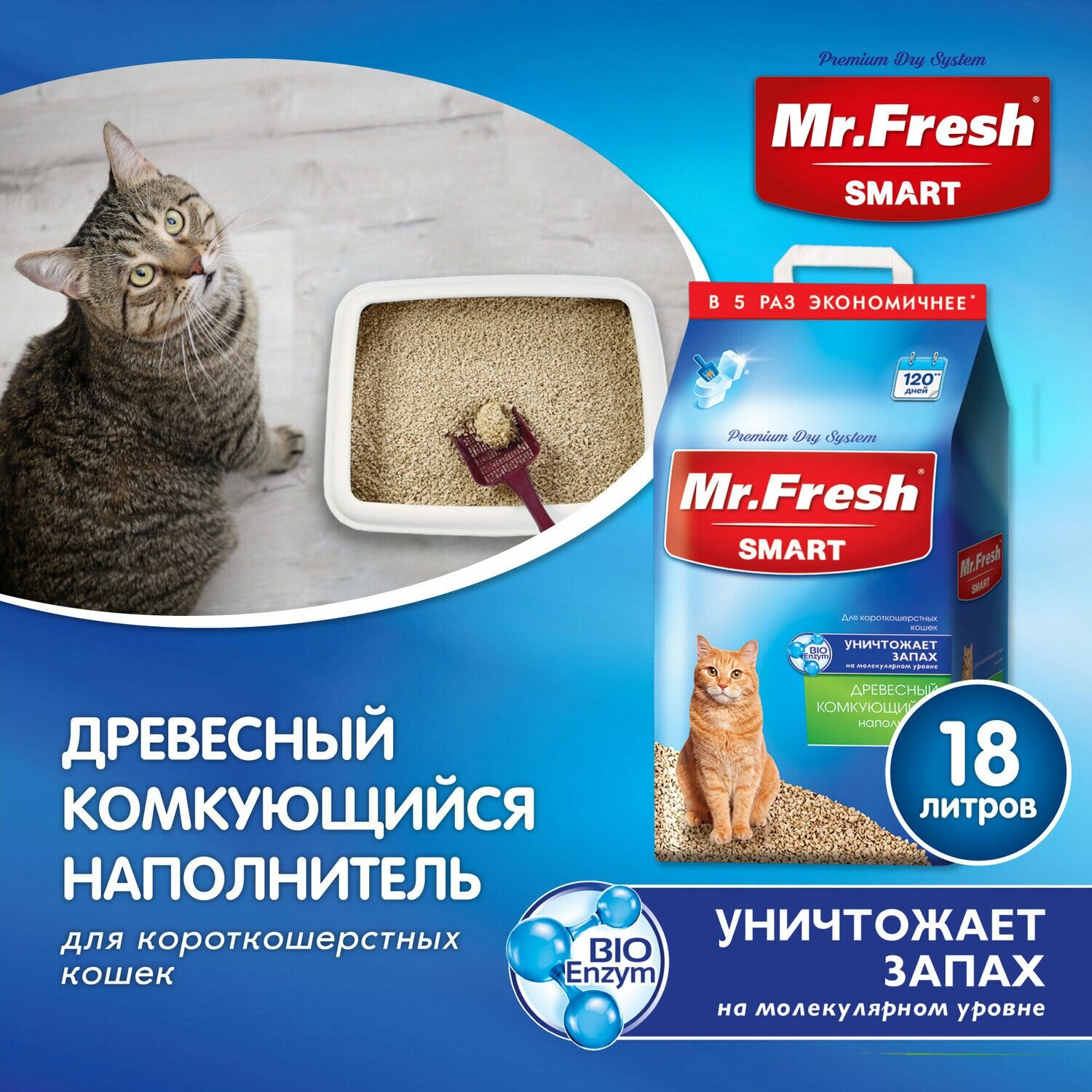 Древесный комкующийся наполнитель Mr.Fresh Smart для короткошерстных кошек 18л/8,4кг