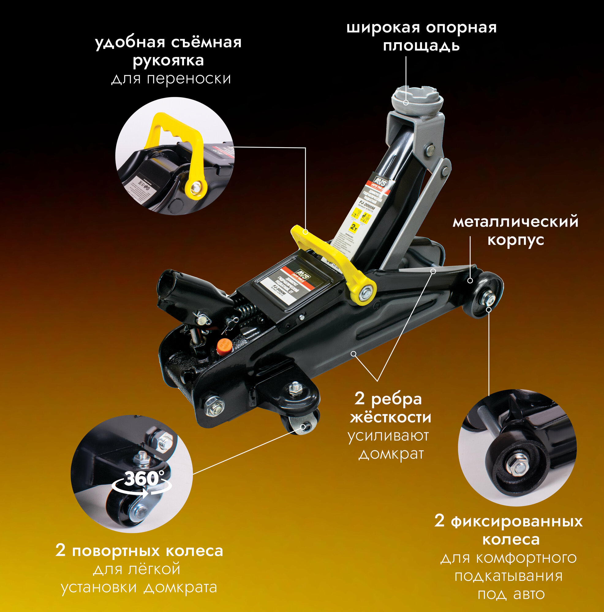 Домкрат автомобильный (подкатной) гидравлический AVS FJ-2000AL (поворотная ручка 360 градусов), 2 тонны, A07814S