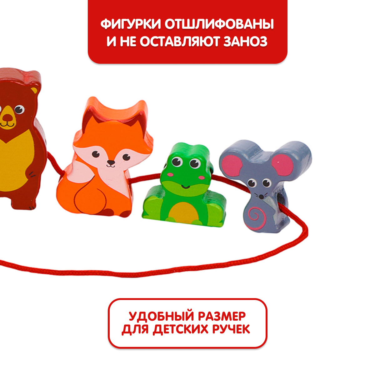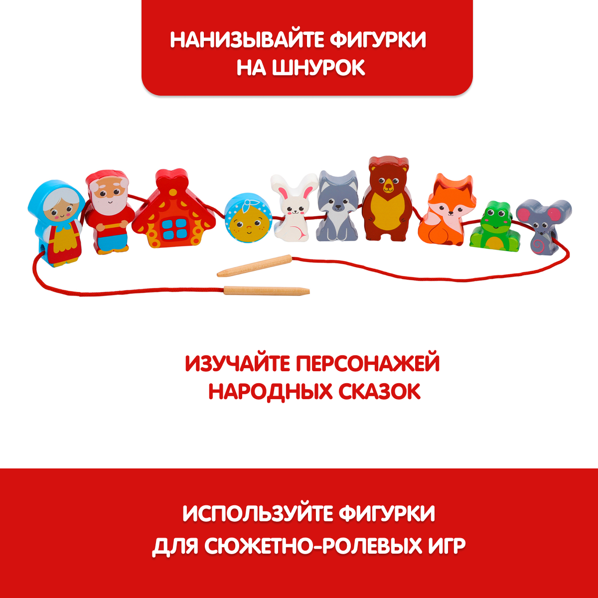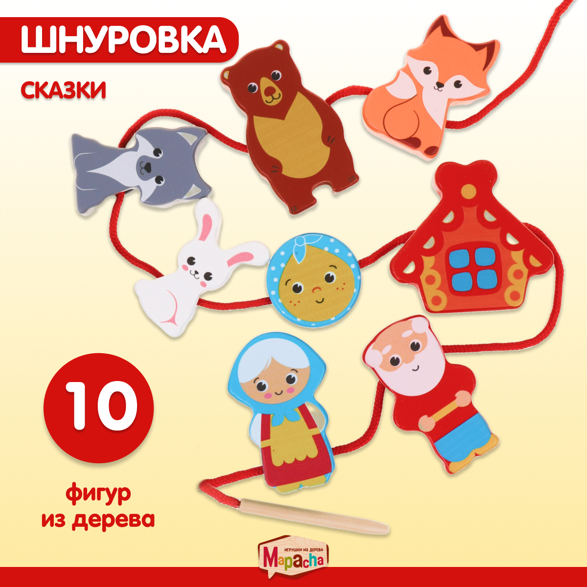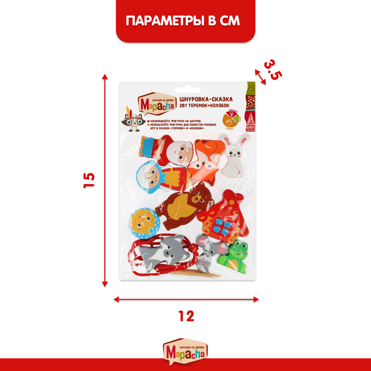 Купить Шнуровка деревянная на шнурке Теремок + Колобок 10 деталей 3-6 см, развитие мелкой моторики Mapacha