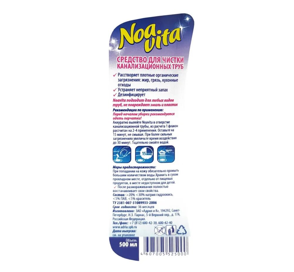 Средство для устранения засоров Адриа "Ноавита", Быстрый эффект, 500 мл интересное: