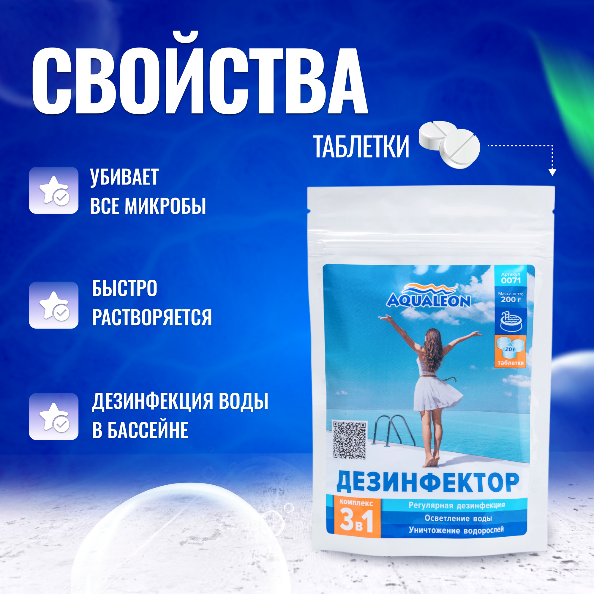 Медленный хлор для бассейна (МСХ КД) Aqualeon комплексный таблетки по 200 гр., 0,6 кг