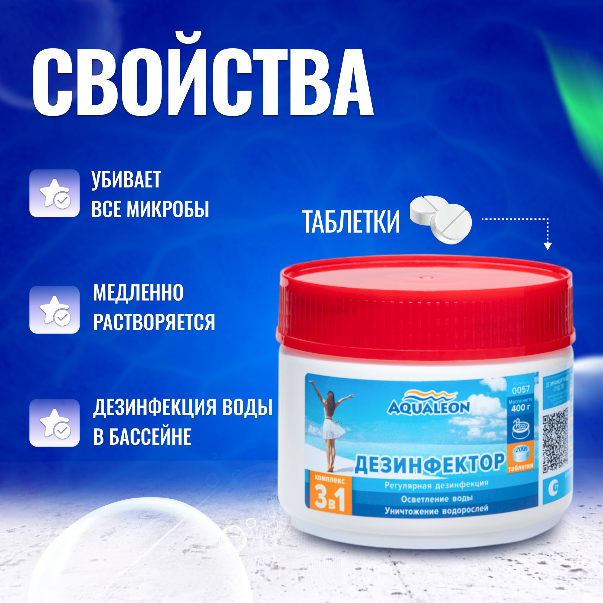 Дезинфектор Aqualeon медленный хлор 3 в 1 в таблетках по 200 гр., 0,4 кг