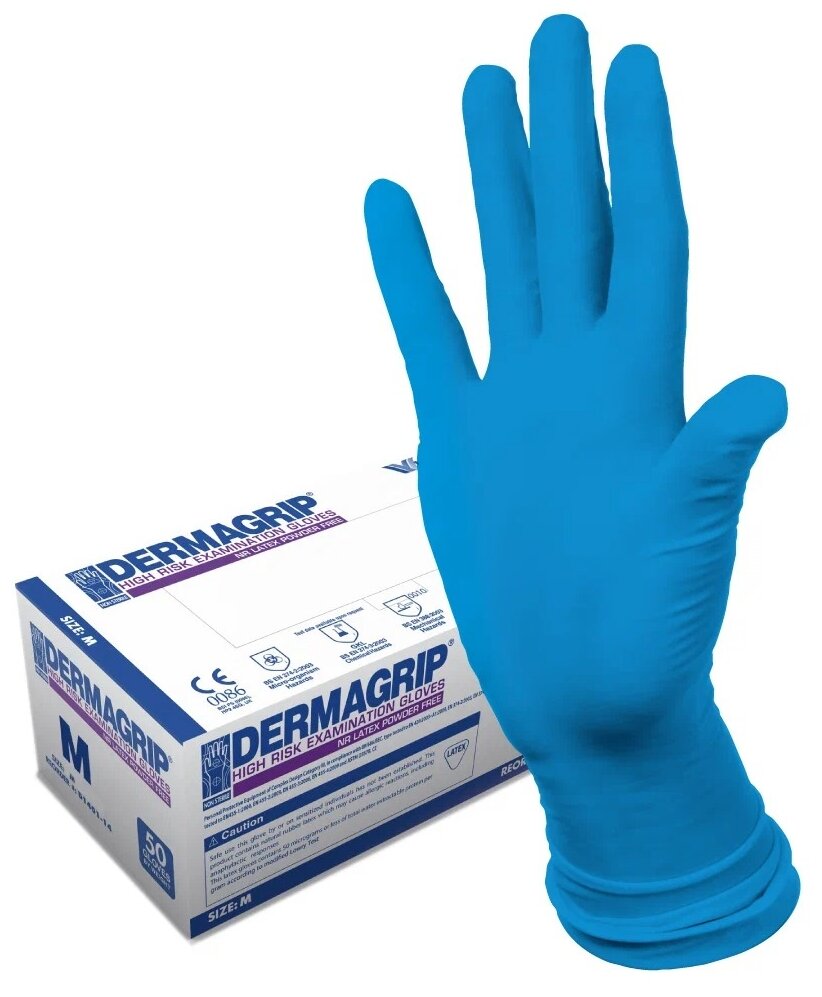 DERMAGRIP Перчатки латексные неопудренные High Risk, смотровые, нестерильные, текстурированные, размер M, 30 гр, 50 шт/уп (25 пар), цвет голубой