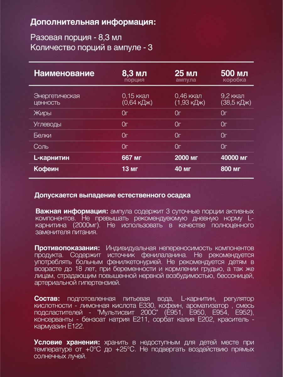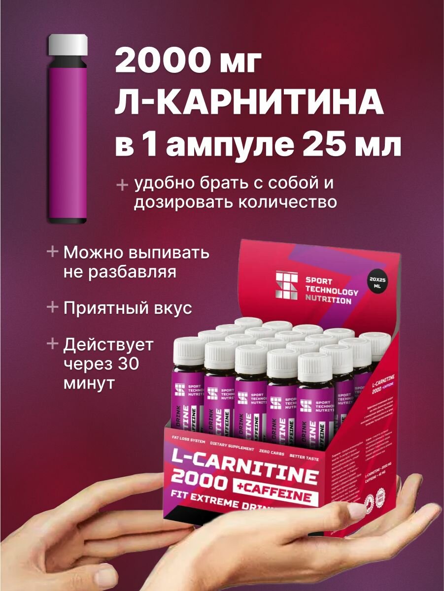 L-карнитин 2000 мг, 20 ампул по 25 мл, яблоко брусника, жиросжигатель для похудения мужчинам и женщинам, Л карнитин