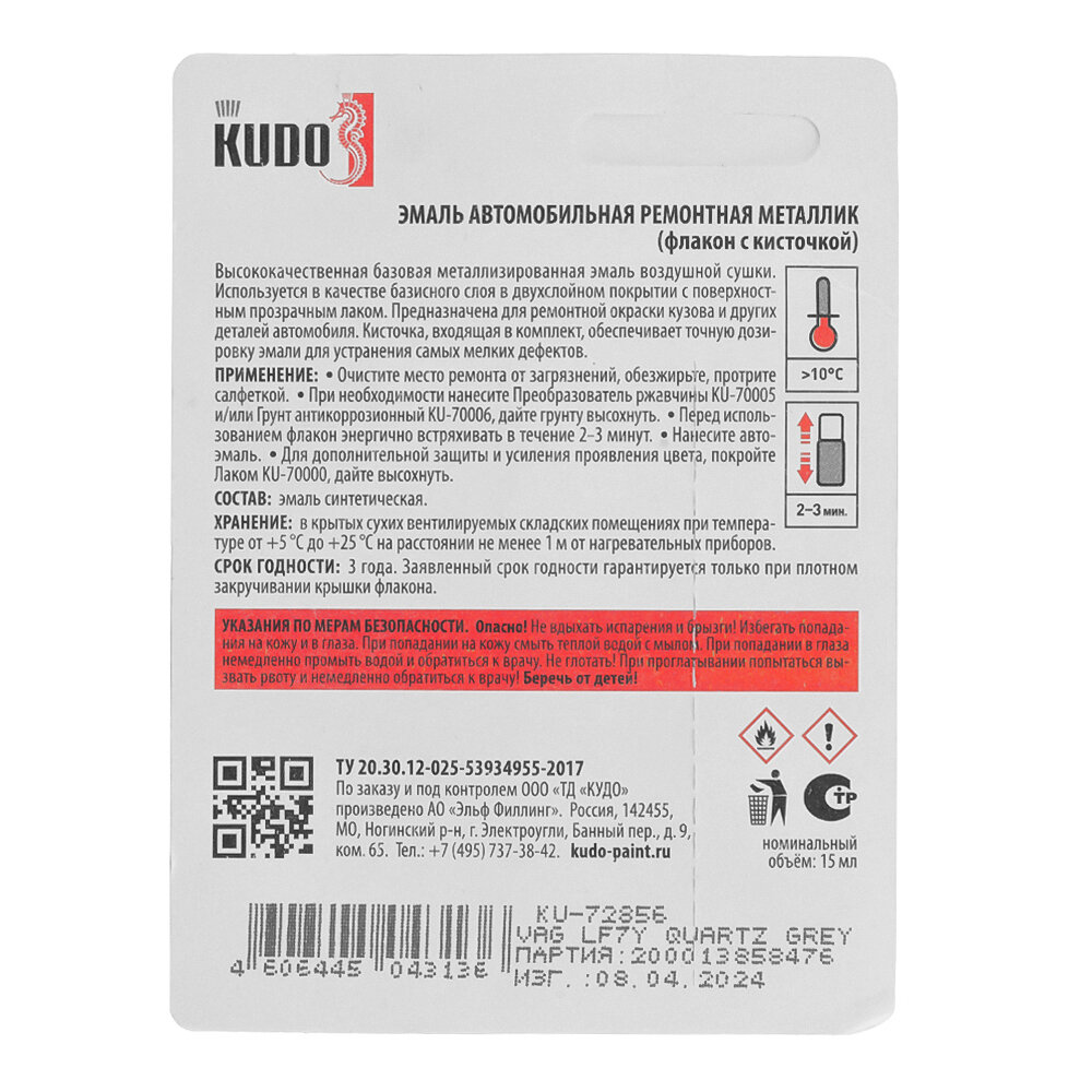 Подкраска KU-72856 VAG(VW/Audi/Skoda) LF7Y Quartz Grey(серый) 15мл с кистью KUDO