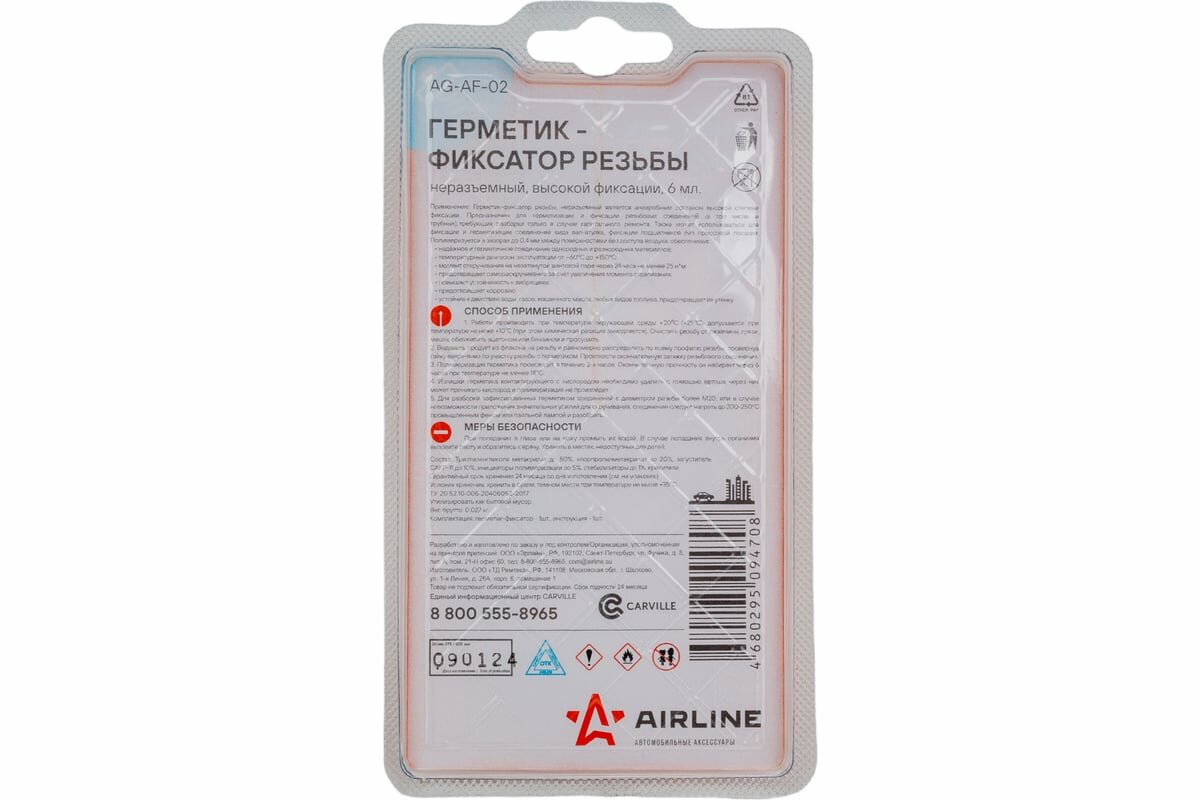 AIRLINE AGAF02 герметик-фиксатор резьбы, неразъемный, высокой фиксации, 6 МЛ. (AG-AF-02)