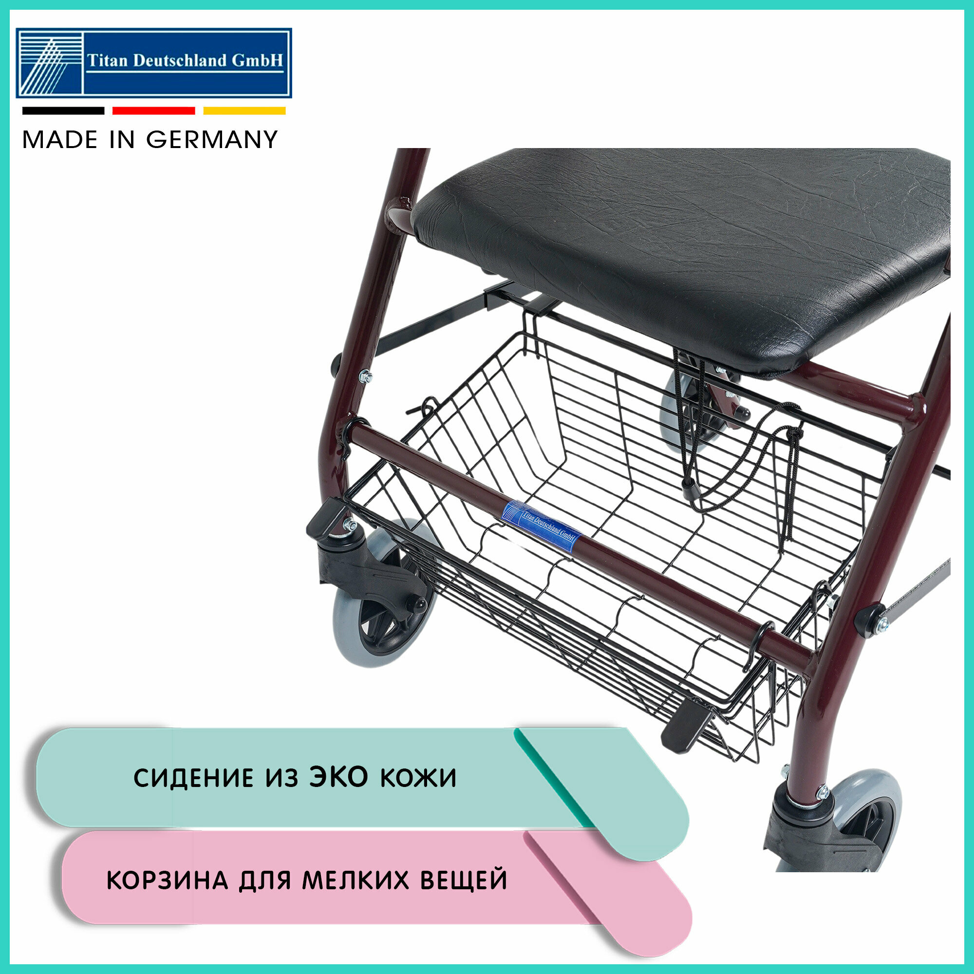 Ходунки роллаторы на четырех колесах германия Titan Deutschland GmbH складные для взрослых, пожилых людей и инвалидов с повышенной грузоподъемностью 130 кг OPTIMAL-KAPPA , LY-561W