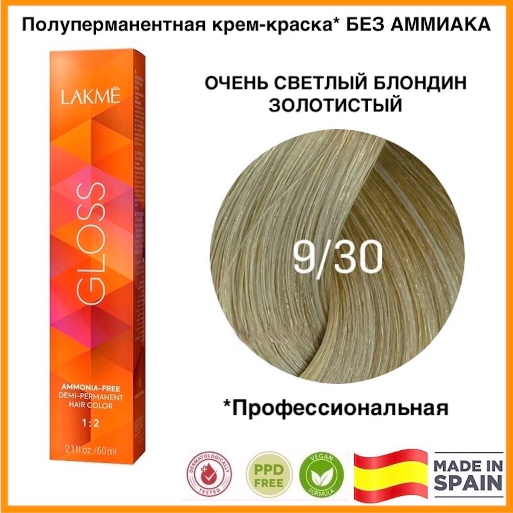LAKMÉ, GLOSS, Крем-краска для волос тонирующая №9/30, суперсветло-белокурый золотистый, 60 мл