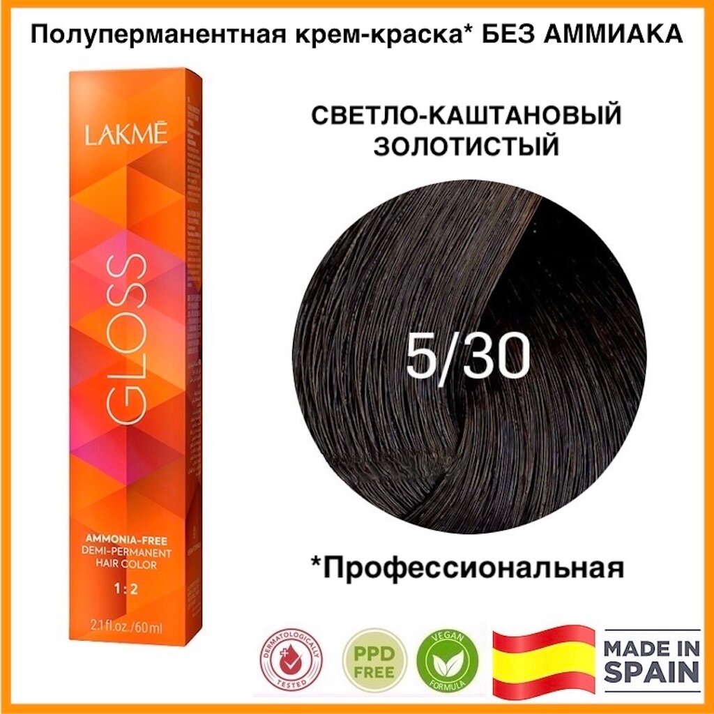LAKMÉ, GLOSS, Крем-краска для волос тонирующая №5/30, светло-каштановый золотистый, 60 мл