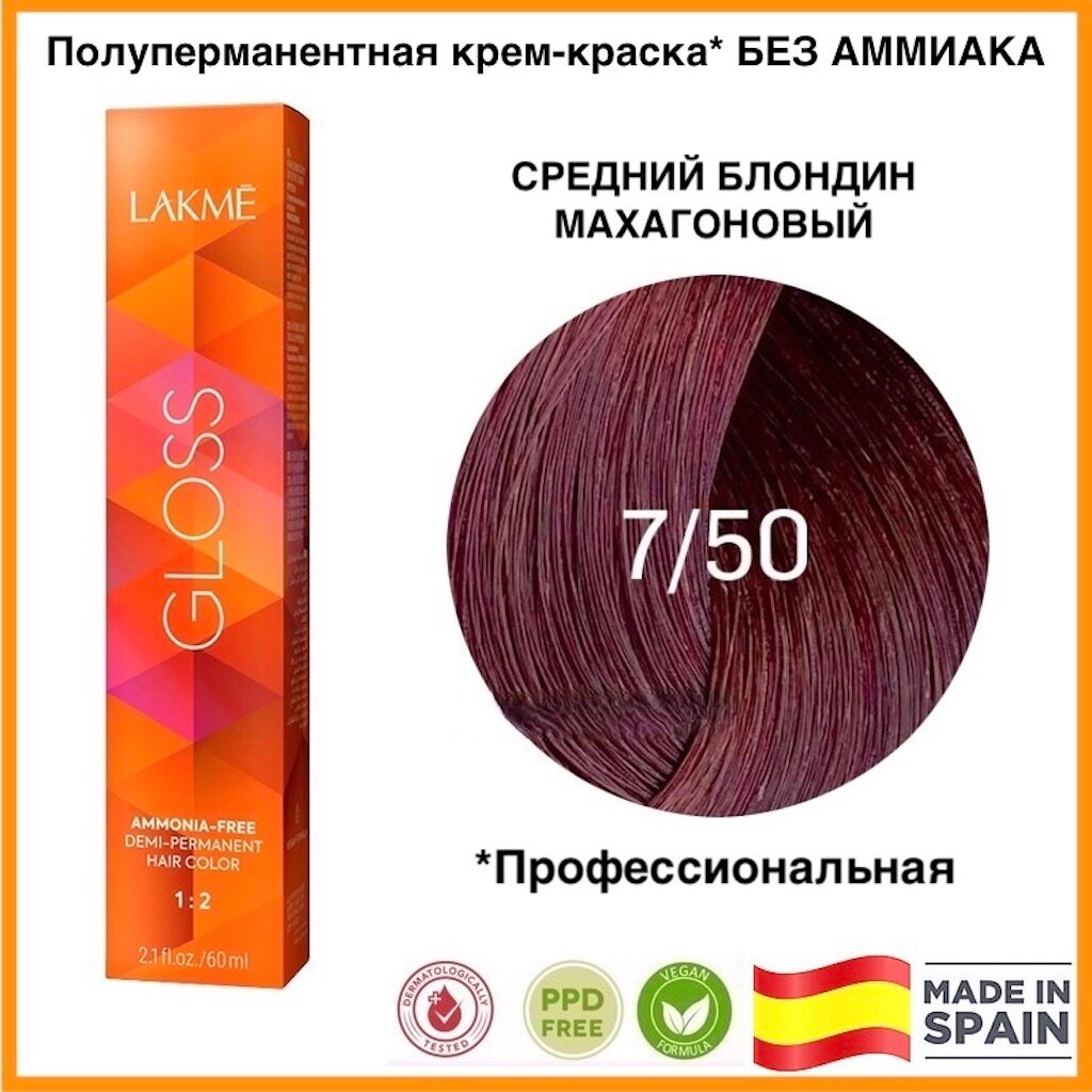 LAKMÉ, GLOSS, Крем-краска для волос тонирующая №7/50, средне-белокурый с оттенком красного дерева, 60 мл