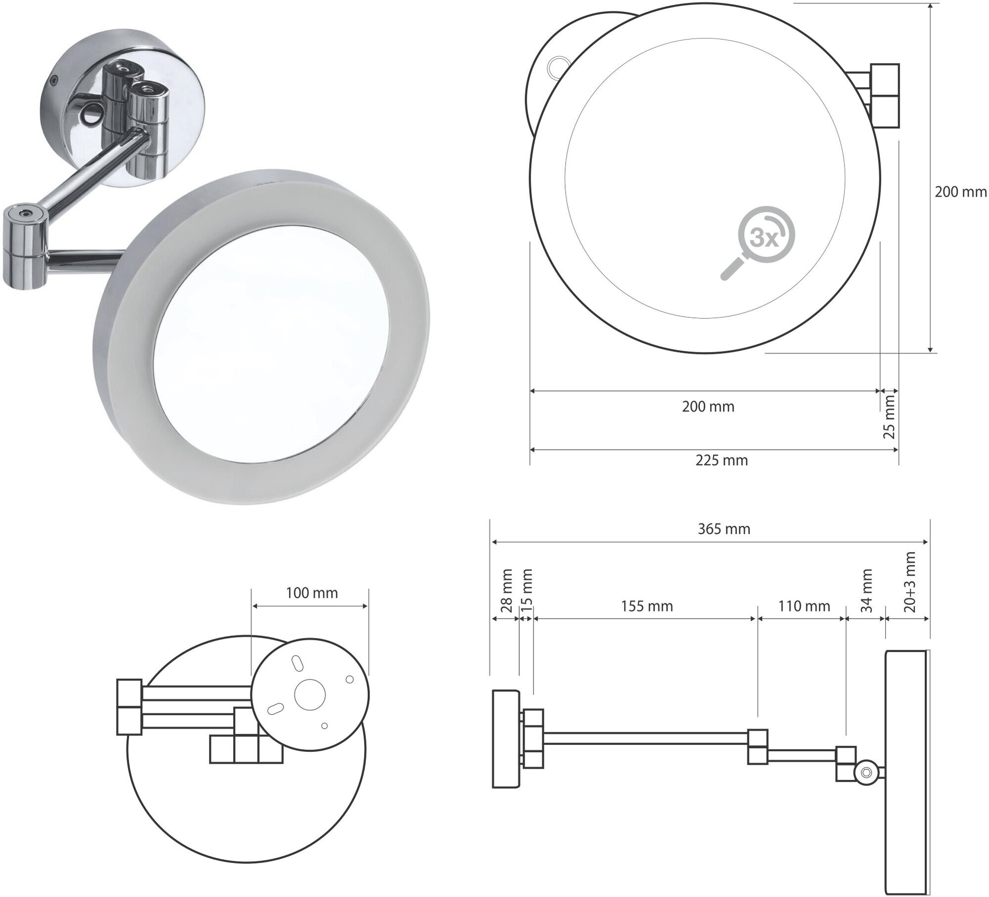 Bemeta Косметическое зеркало с подсв., подвесн., 3х кр. увелич., 22,5x20h см, цвет: хром 116101772