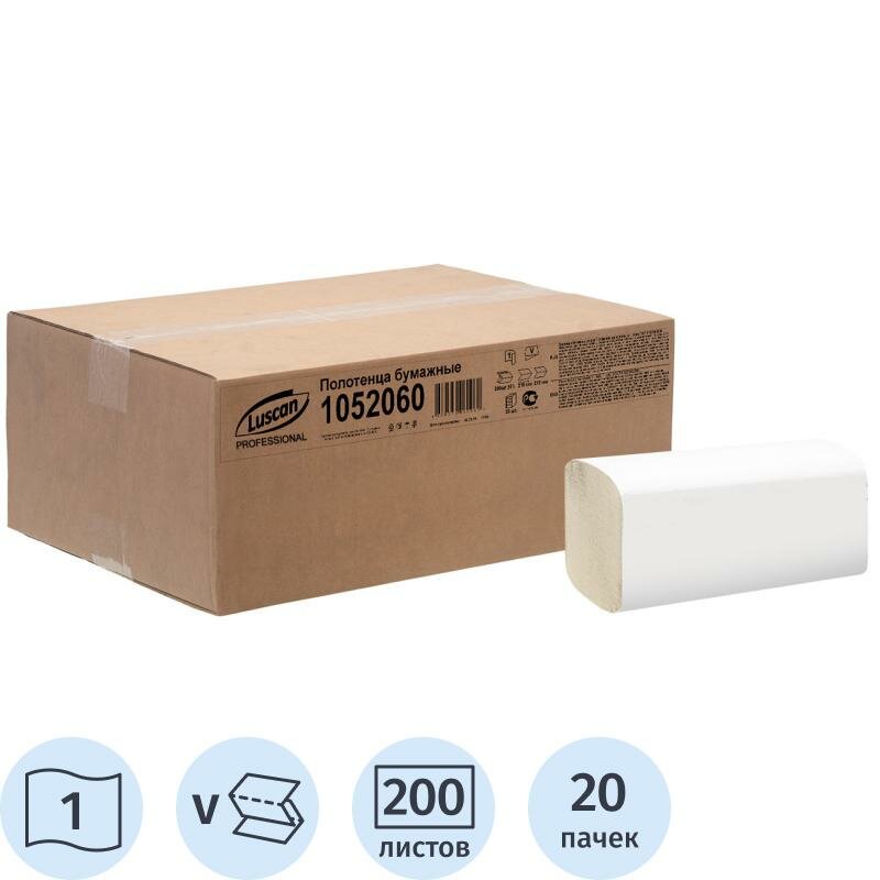 Полотенца бумажные для диспенсеров Luscan Professional V-сложения 1-слойные 200 листов 20 пачек в упаковке